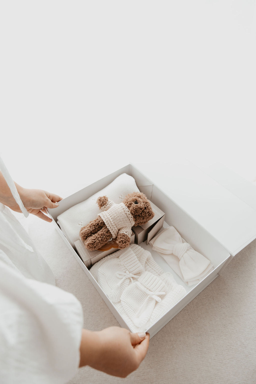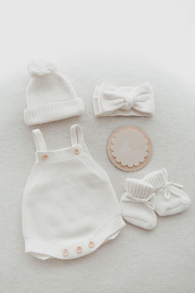 Complete the look with one of our knit rompers and beanies or bows. A cute way to introduce your new little love to the world and keep them cosy.