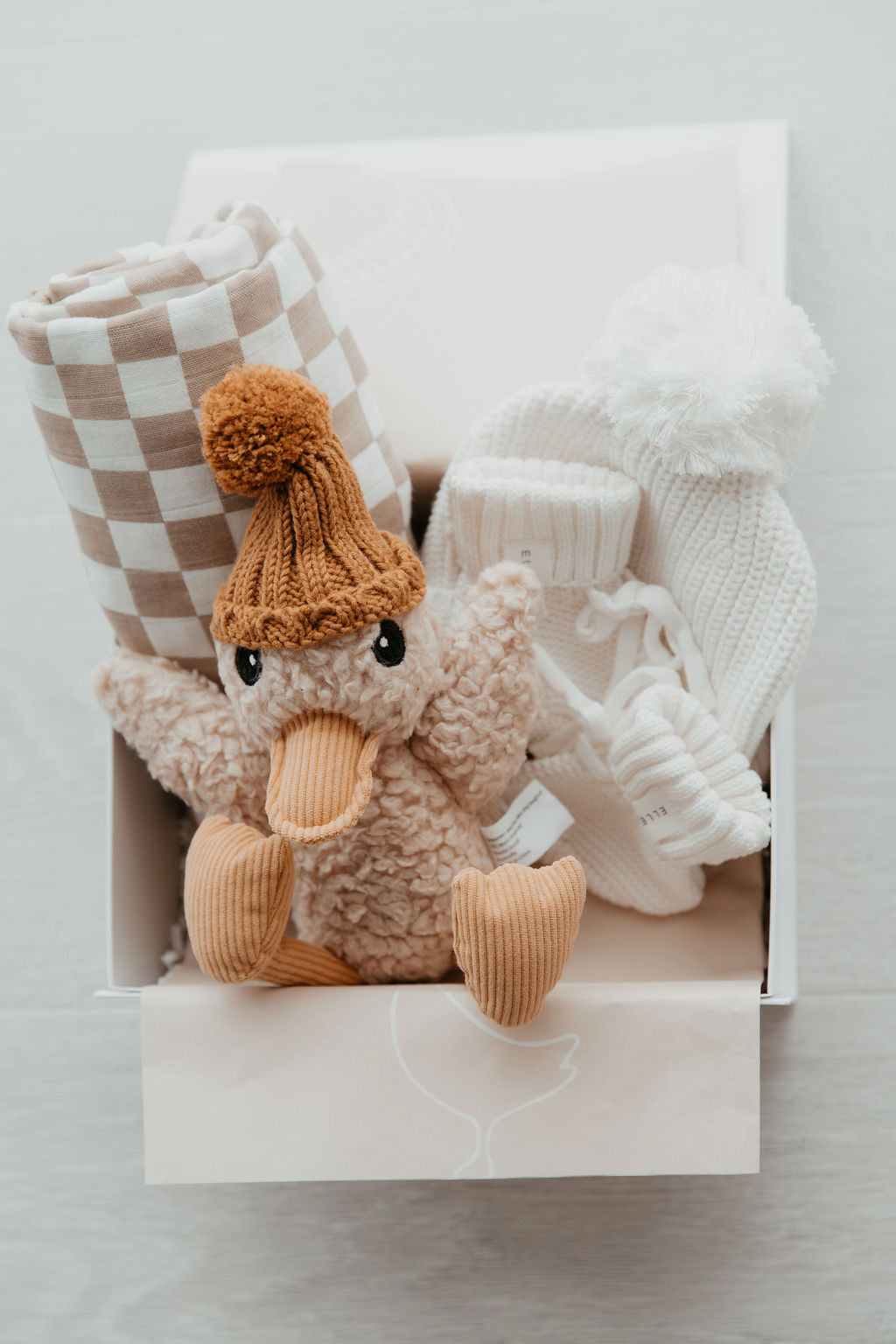Teddy, the perfect box to say Welcome to the world little one. With a cozy swaddle, a cuddly duck and something to keep those little toes and that little head warm. Curated by us, gifted by you.